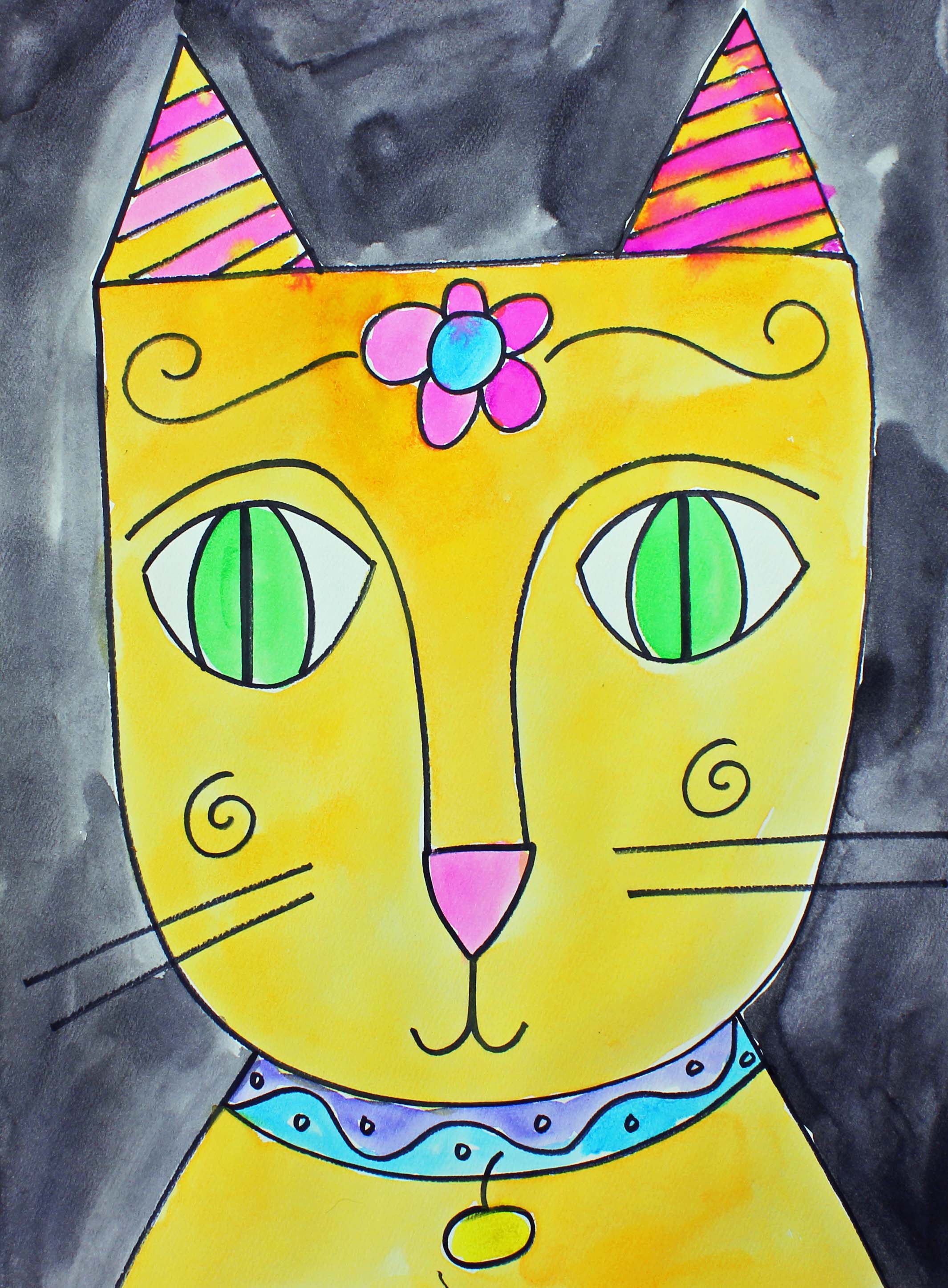 Art Project for Kids: How to Draw and Watercolor Paint a Folk Art Cat