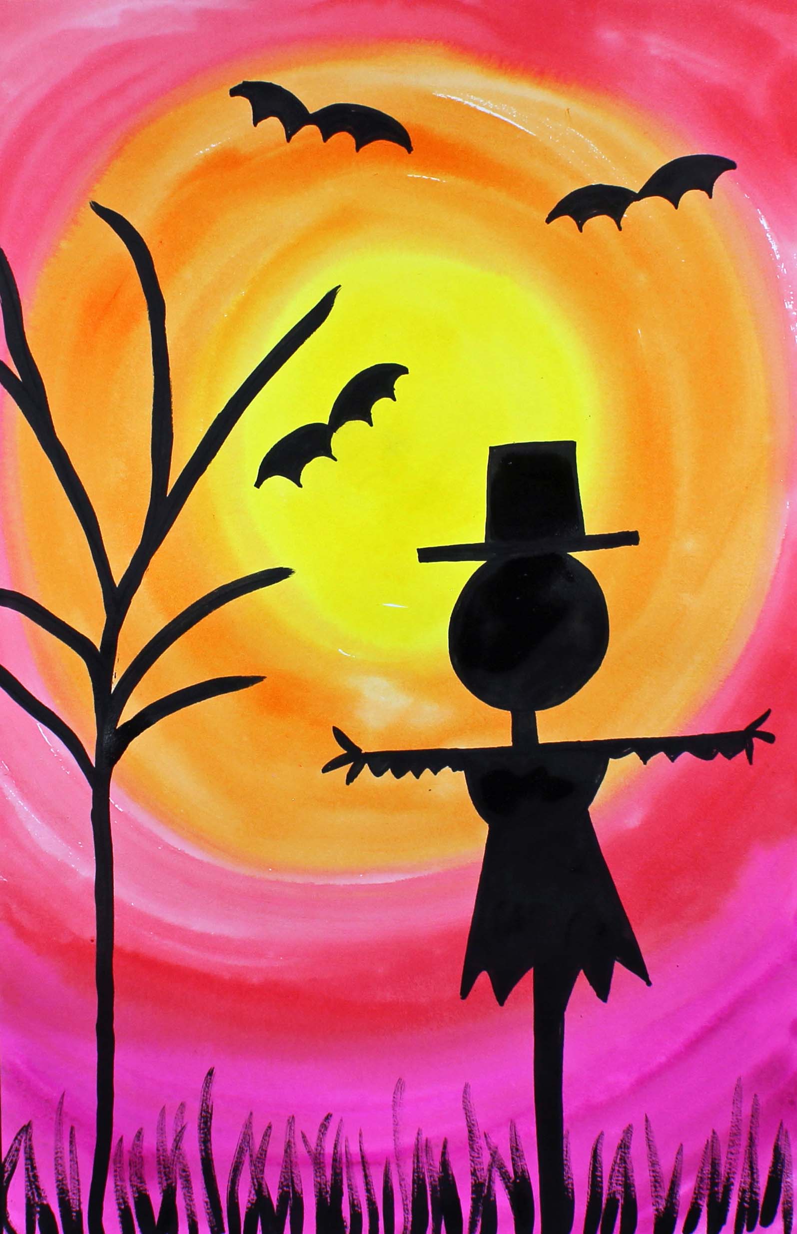 Art Project for Kids: How to Draw and Paint a Pumpkin Scarecrow at Sunset